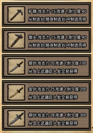 9、矿镐、锄头、银剑、金剑、钢剑;