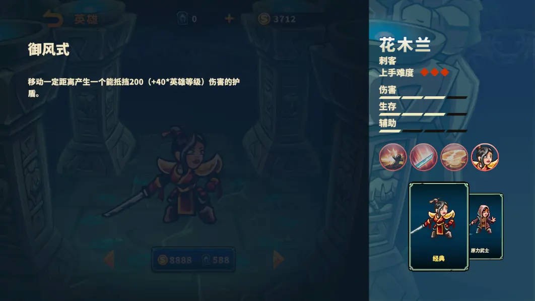 花木兰是一位刺客类型英雄,其拥有较高的伤害和生存能力,机动性强